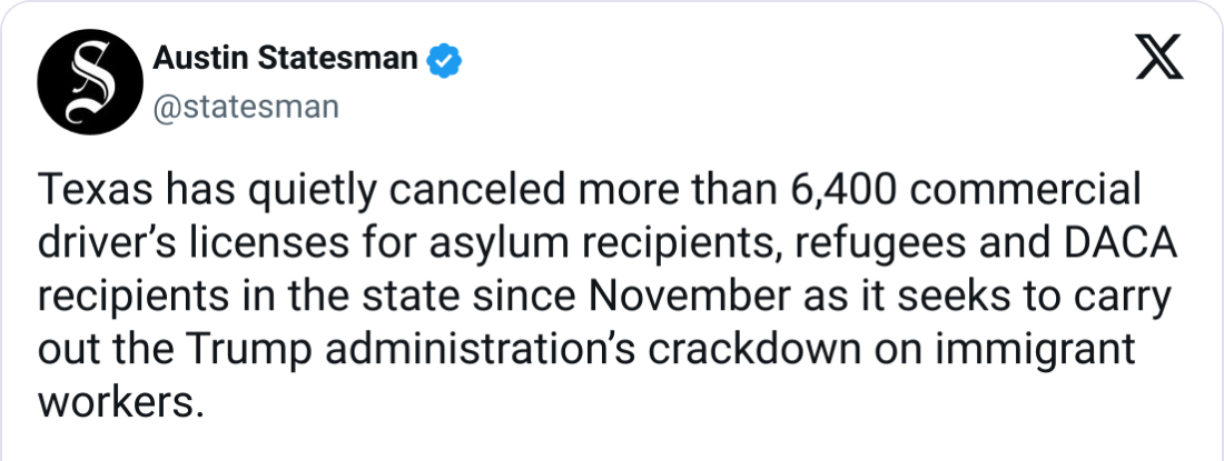 ❌ Texas CDL Revocations. Texas has revoked roughly 6,400 commercial licenses since Nov 2025 in its bid to follow current immigration policy changes.
