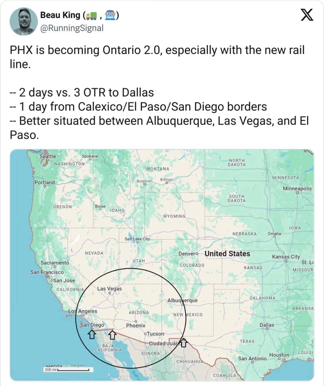 🚛 Phoenix Rise to Bustling Freight Hub. Phoenix is quickly becoming a freight hub similar to Ontario, California with a new rail line, reducing transit times to Dallas and improving connectivity between key cities.