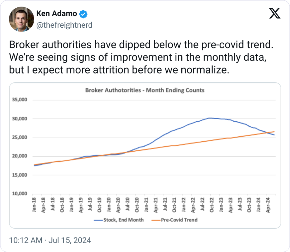 📉 Is the Tide Turning? Ken Adamo shared data on the dip of broker authorities below the pre-covid trend. Though a lot of factors can impact authority count, Adamo and others point out that the direction and rate of change are the main focus here.