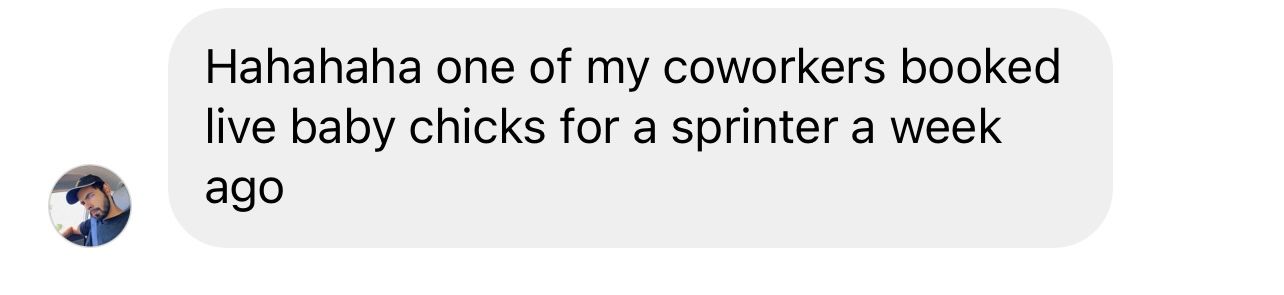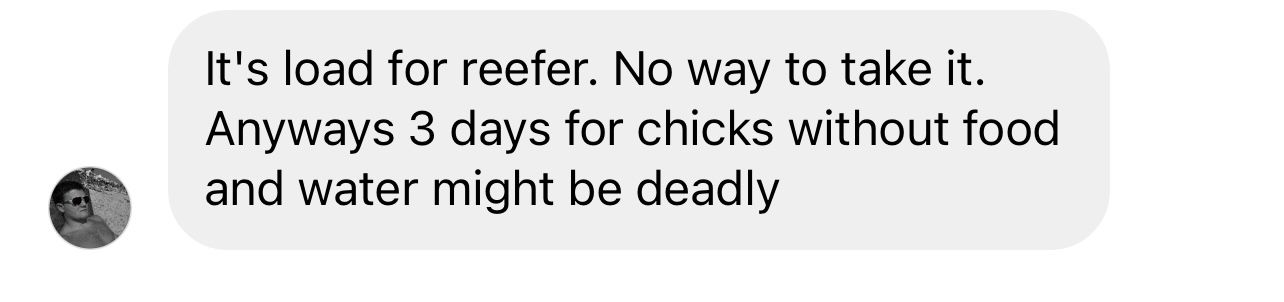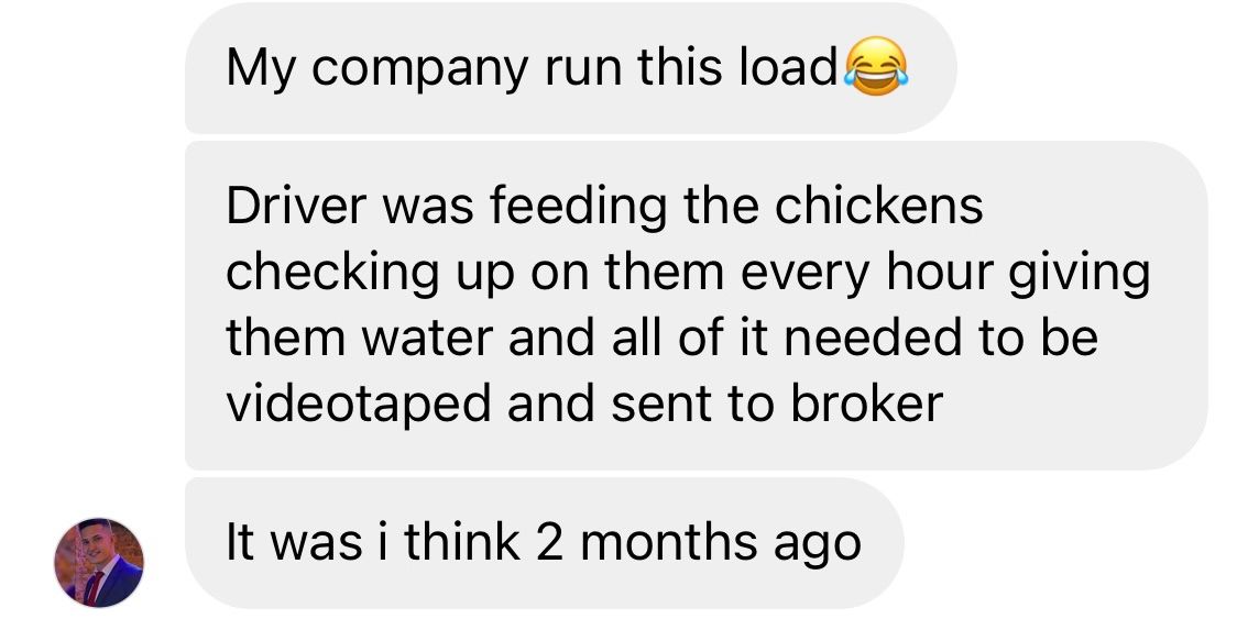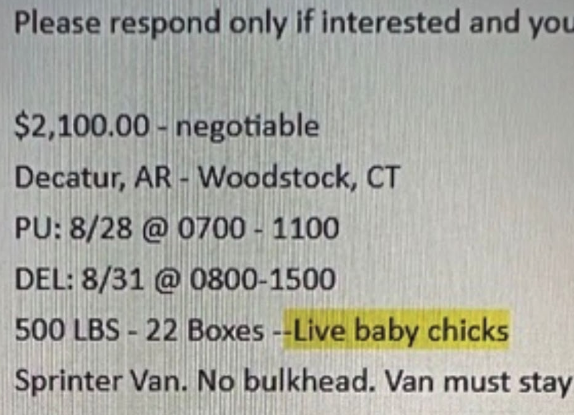 On Friday, one of our Instagram followers sent us a screenshot detailing a load of live chicks. The shipment included 22 boxes, weighing a total of 500 lbs, filled with chirping baby chicks. They were set to be transported from Decatur, AR to Woodstock, CT over three days.
