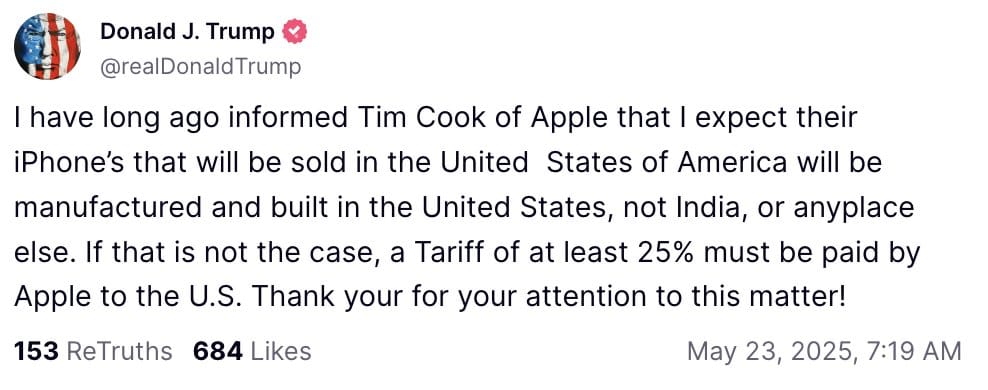 Just now, Trump threatened a 25% tariff on iPhones made in India, calling out Apple CEO Tim Cook directly.