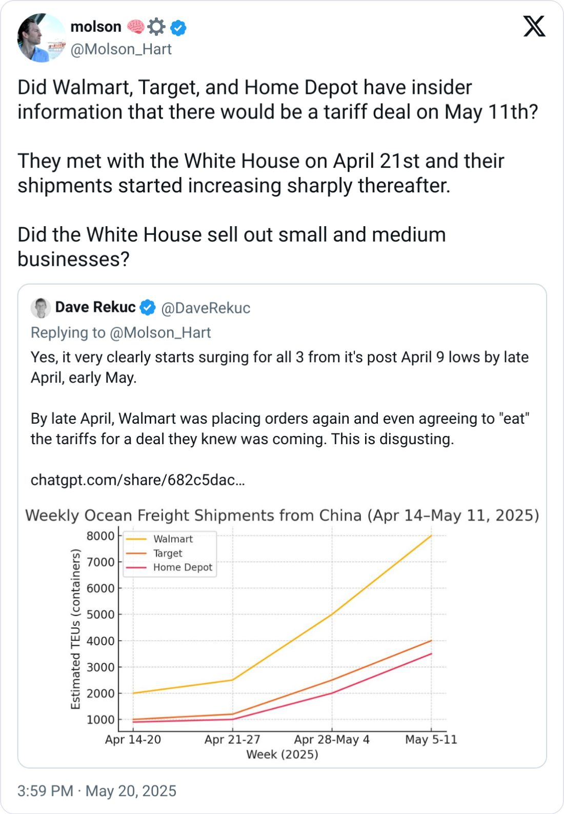 Just days after their April 21 meeting at the White House, Walmart, Target, and Home Depot ramped up imports from China, with weekly container volumes surging in early May...well ahead of Trump’s May 11 tariff truce.