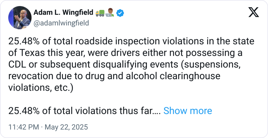 🚨 Texas CDL Violations Surge. An FMCSA audit of trucking companies in the state revealed that 4% of audited drivers lacked a valid CDL, and 25.48% of driver-related inspection violations involved missing, suspended, or disqualified CDLs.