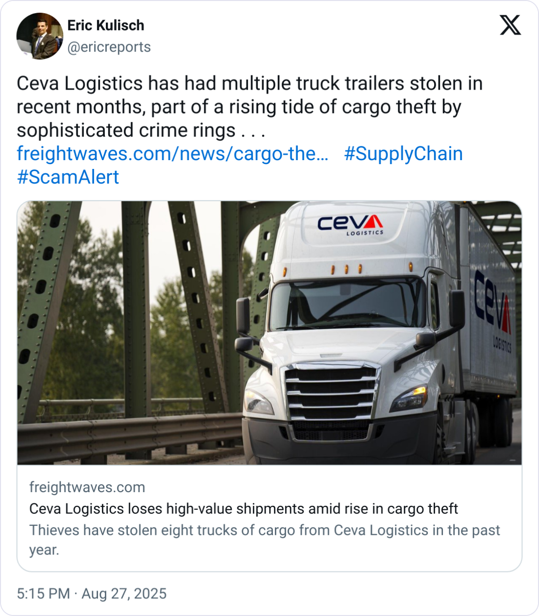 💰 Ceva Logistics Hit by $18 Million Cargo Theft Wave. Ceva Logistics has lost over $18.3 million in electronics to at least eight thefts in the past year, FreightWaves reports. Incidents include the $15 million shipment of Apple and AMD stolen in Reno. Sources blamed lapses such as “outsourcing shipments to unvetted carriers” and leaving trailers in unsecured yards. Ryan Joyce, CEO of GenLogs, said Ceva’s self-insurance meant it “directly absorbed more than $25 million” in losses, urging shippers to demand prevention over recovery. CargoNet data shows thefts rose 27% year-over-year in 2024, with 40% occurring at warehouses, thus highlighting the growing risk for 3PLs and shippers alike.