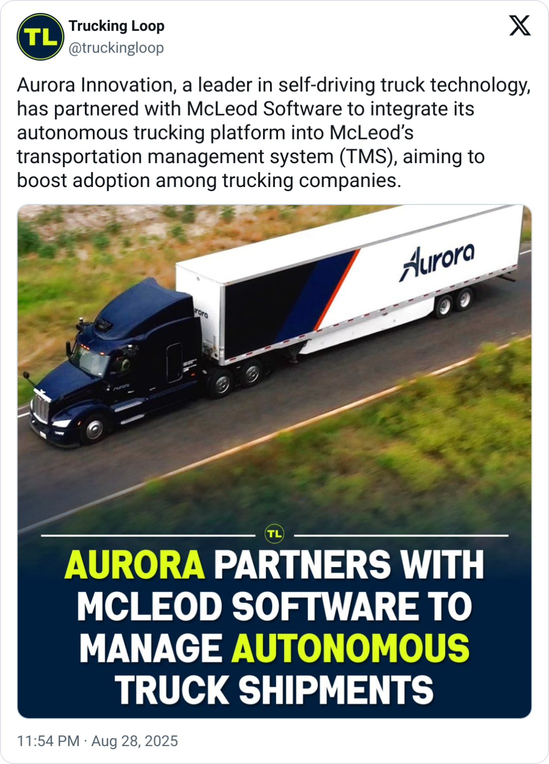 🤖 Aurora-McLeod TMS. Aurora Innovation will link its autonomous truck operations with McLeod Software’s TMS, enabling fleets to schedule, route, and monitor driverless hauls. The integration is set to launch in 2025, targeting major carriers.