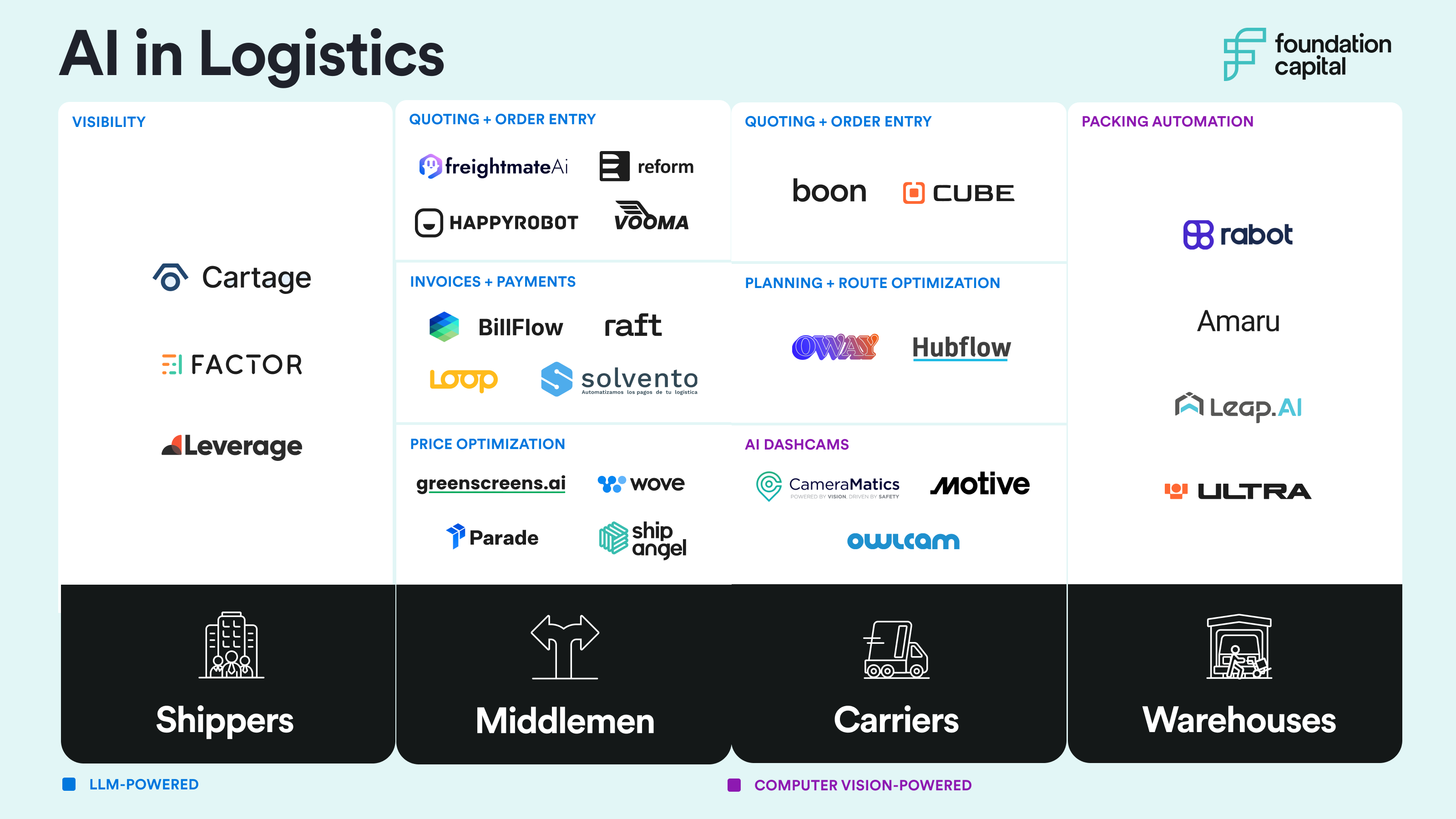 🚚 2024 AI Logistics Top Players? After initially mistakenly including the now-defunct Convoy in the Planning & Route Optimization category, Foundation Capital has released its updated list of top AI logistics players for 2024.