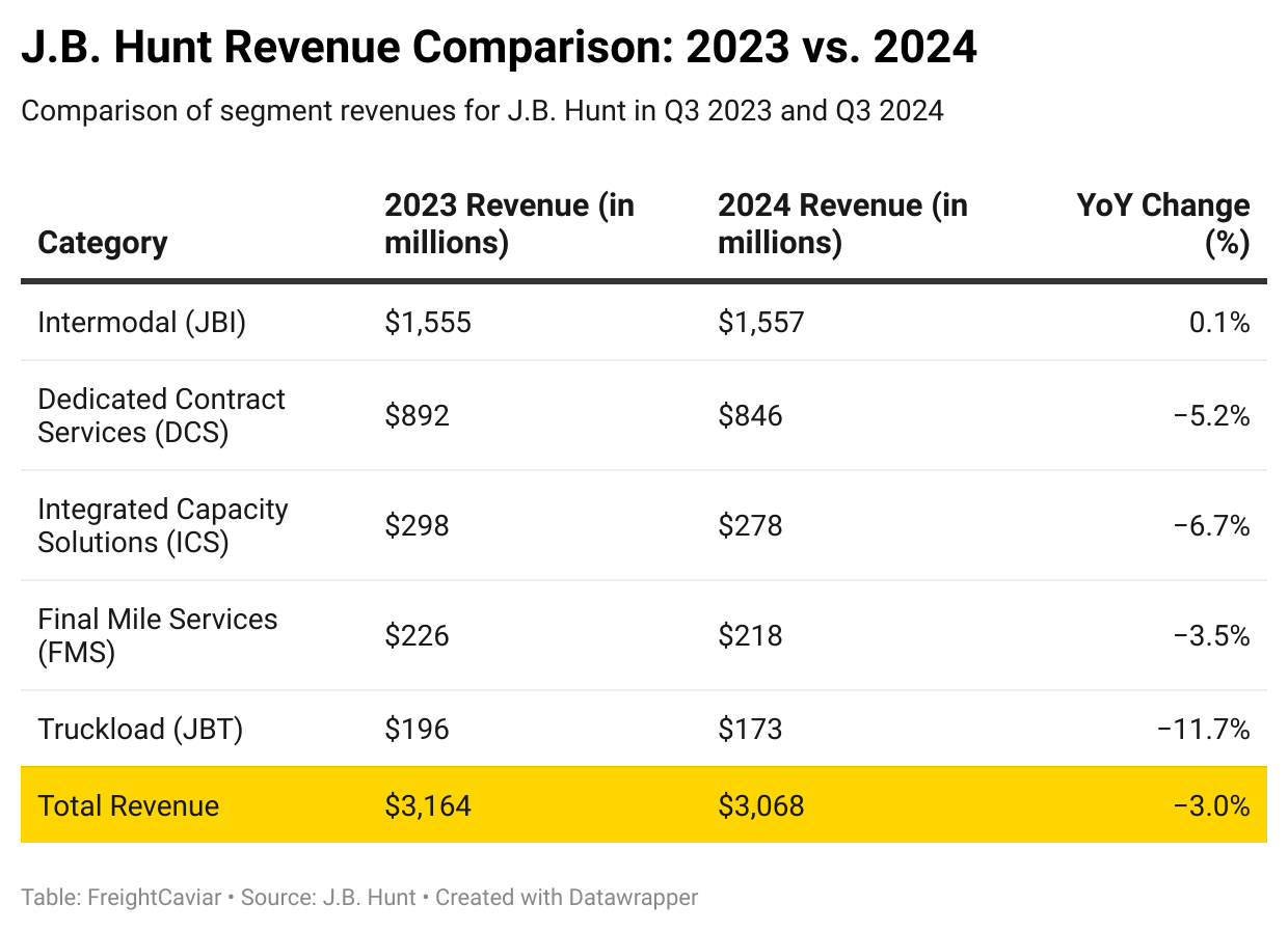 🚚 J.B. Hunt Sees Profit and Revenue Drop in Q3. J.B. Hunt Transport reported a 3Q profit decline, with profits dropping to $152.1 million ($1.49 per share), down from $187.4 million ($1.80 per share) last year in Q3. Despite a 3% revenue decrease to $3.07 billion, the results surpassed Wall Street expectations. CEO Shelley Simpson pointed to challenging market conditions but highlighted a return to typical seasonal demand. By segment: Integrated Capacity Solutions (brokerage) remained flat, Truckload revenue fell 7%, and Dedicated Contract Services (DCS) saw a 5% year-over-year decrease. Despite these declines, shares jumped 6.6% to $186.18 after the earnings report.