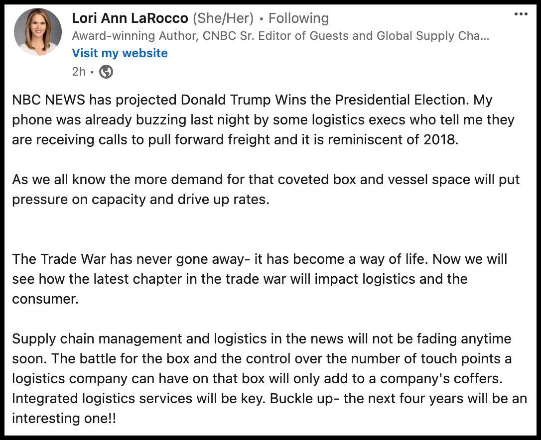 Good morning. With Trump winning the 2025 election, logistics execs are already bracing for potential impacts on freight, from tariffs to energy policies. Hereās a quick look at what his policies might mean for the industry.