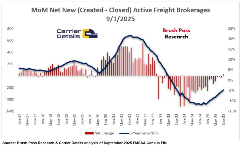 For the first time since late 2022, the number of active freight brokerages ticked up. August closed with 29 more brokerages, the biggest monthly gain since November 2022.