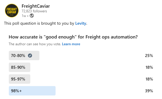 To explore what freight professionals really expect from automation, we ran a poll on Freight Caviar’s LinkedIn page. The question was simple: How accurate is “good enough” for freight ops automation?