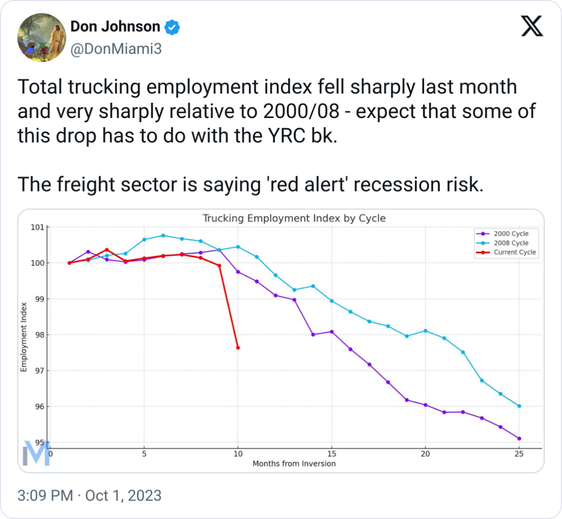 🚨 Recession Red Alert. Economist Don Johnson's tweet warns of recession risk due to a sharp drop in the trucking employment index, in part due to Yellow's bankruptcy.