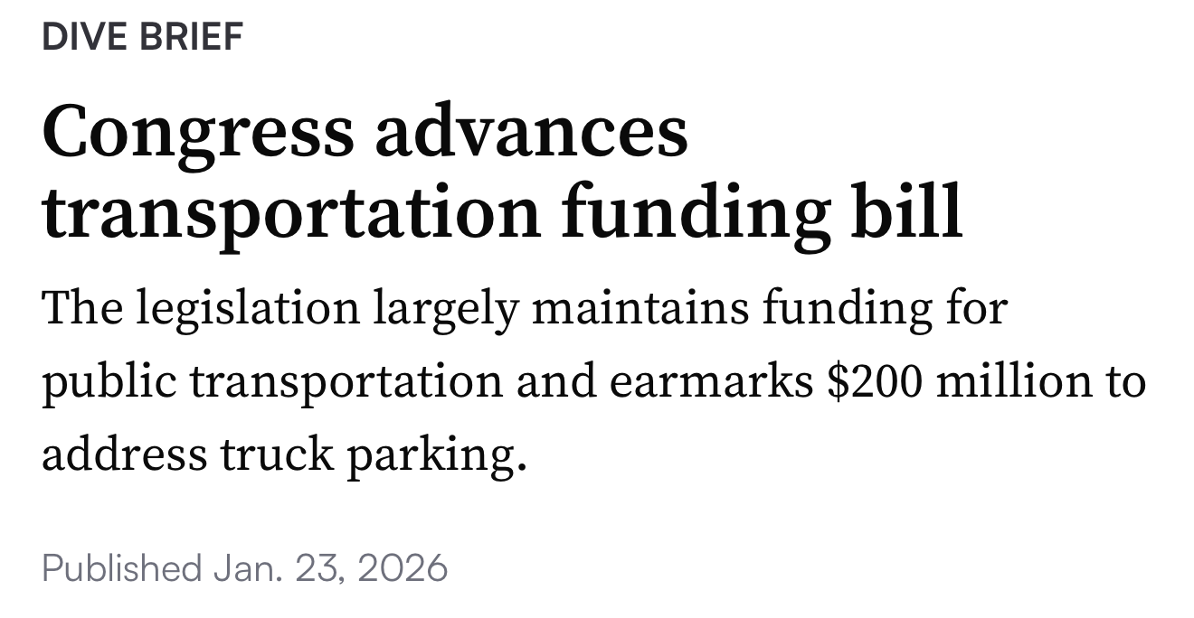 ⚖ Congress Advances Transportation Funding Bill. Lawmakers advanced a bipartisan FY26 transportation funding bill that preserves most of the Infrastructure Investment and Jobs Act's transit spending and earmarks $200 million for truck parking. The House passed the bill 341–88; the Senate votes next week. The package also codifies English-language proficiency enforcement, requiring FMCSA to place noncompliant drivers out of service. OOIDA President Todd Spencer called it “common sense” for road safety. Public transit receives $21.1 billion, while Amtrak and intercity rail grants face sharp cuts.